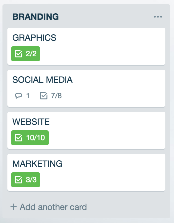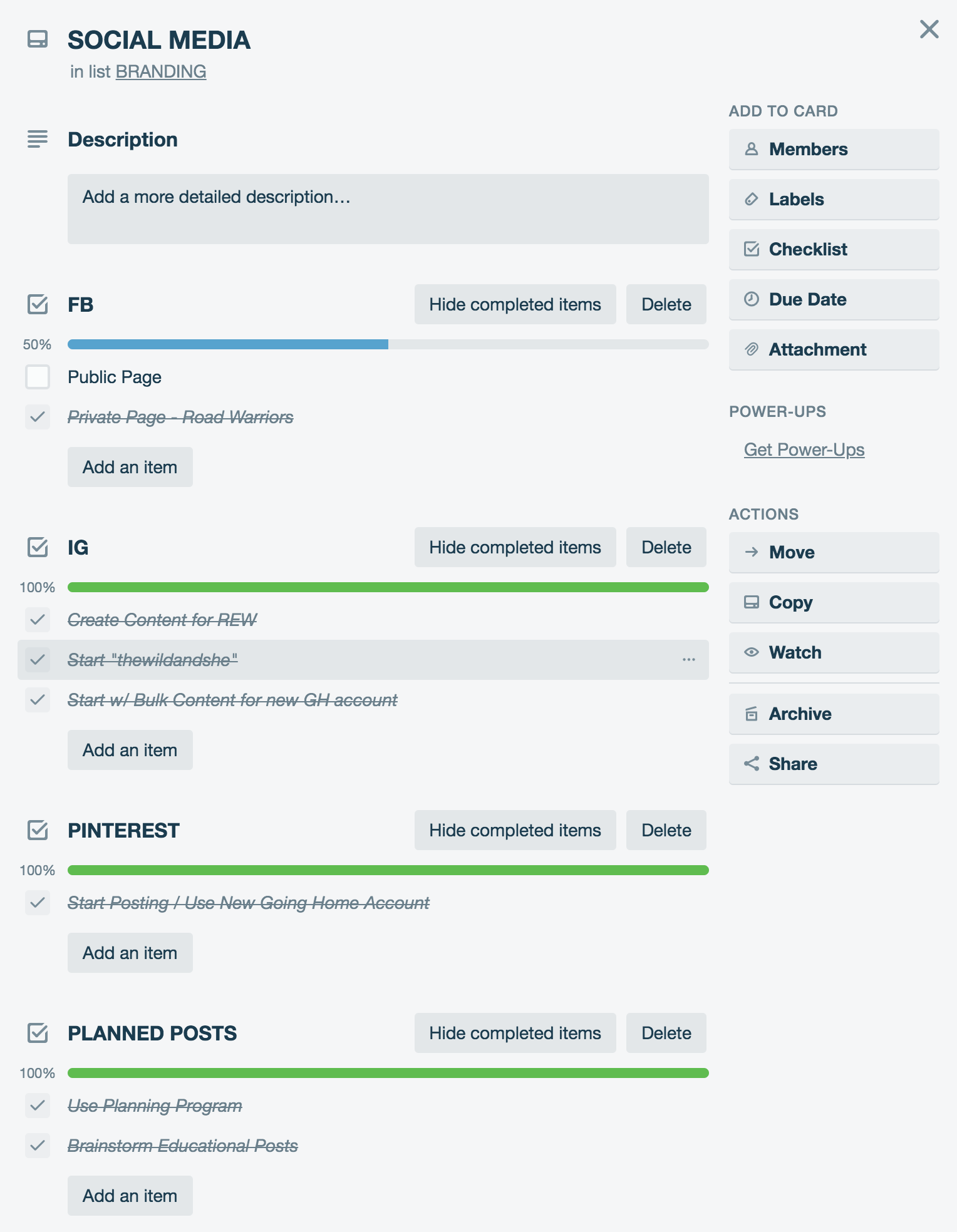 Now that you see how each of the sections work, and how they house cards underneath it, I’ll open up those cards and show you how customized they can be and some of the options you have for creating the perfect boards to keep you organized. Let’s review the Branding board because, fuck yes, I love branding.