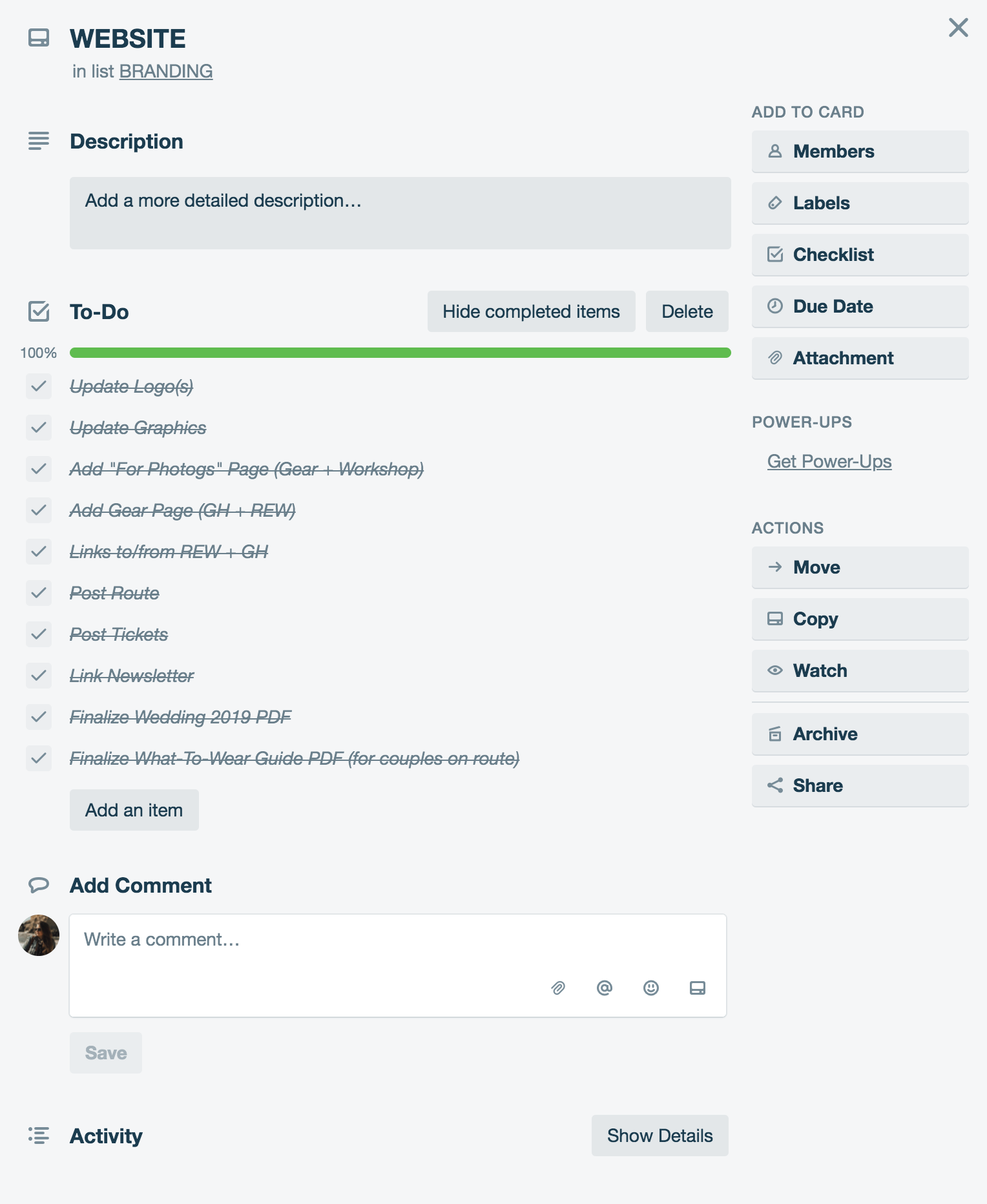 The card on the right shows what it looks like when you haven’t yet fully completed your card. And actually now that I’m looking at it, I totally did complete it but never checked that last bad boy off. Don’t judge. I subconsciously left it there for this occasion. I wanted to add new branding and push new marketing campaigns on the platforms shown in the card on the right side. Facebook - make a public page (I DID, I SWEAR! IT’S HERE!) and make a private group. Instagram, create new content for the Road’s End Workshop account, start TheWildAndShe (my personal) and start a new account just for our wedding work. Check, check and chhhheck! Plus, this entire board is shared with my “team” so my husband can see, modify and check things off these lists! Teamwork and dreamwork and all those cheesy motivational quotes. Trello even has a vast assortment of “power-ups” which kinda work like widgets or complimentary accessories to bulk out your experience. For example, one of the featured power-ups is called Xero Projects and when added to a card, it will time how long that card and board have been active. This can help when it comes time to invoice a client. Or The Butler which is a power-up that works kinda like If That Than This, and creates rules to follow when things happen on your board. Lot’s of nifty additions to keep your boards, your cards, and your brain, super organized and task oriented. Get on it!