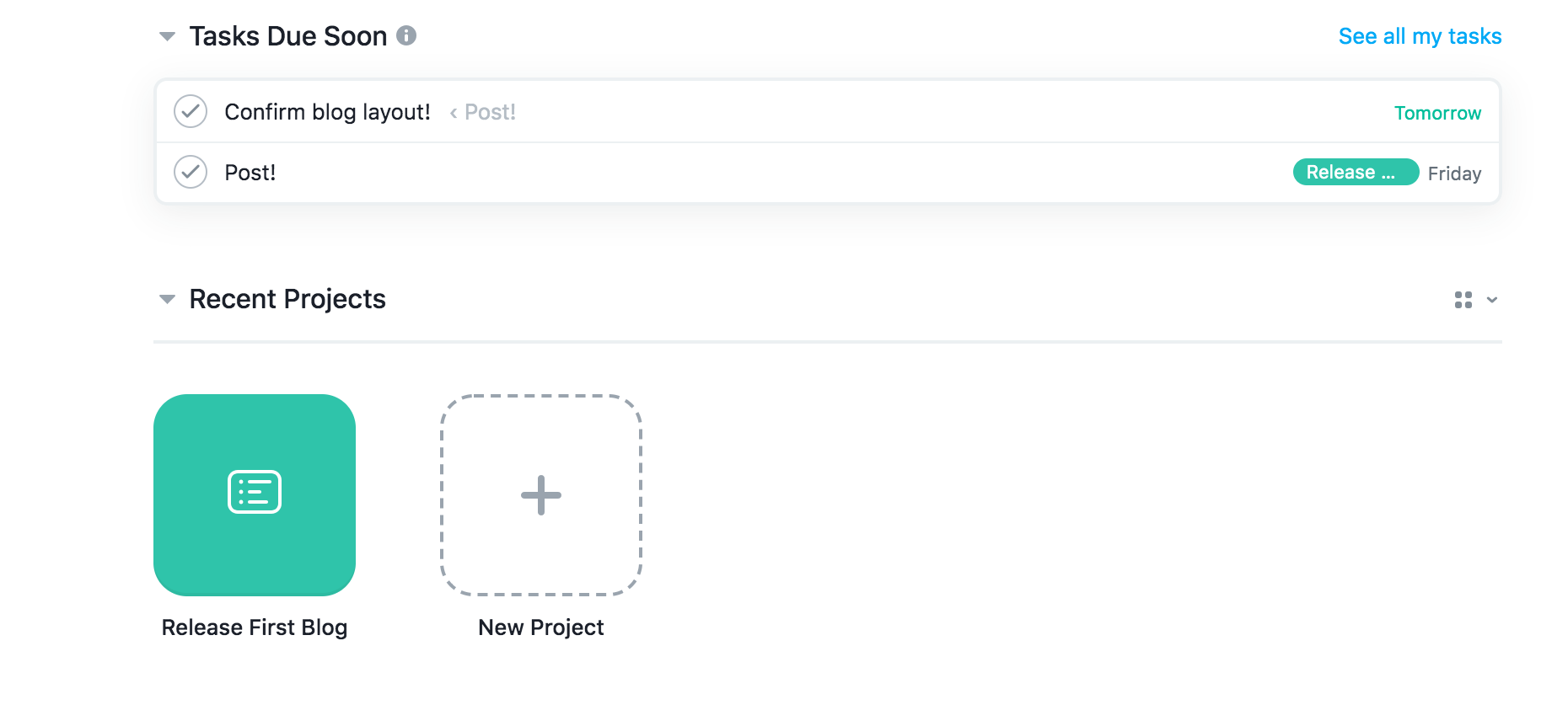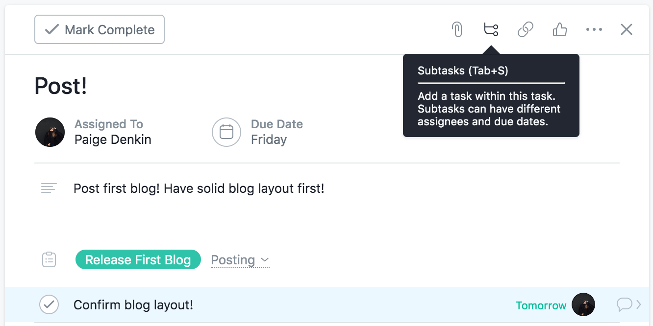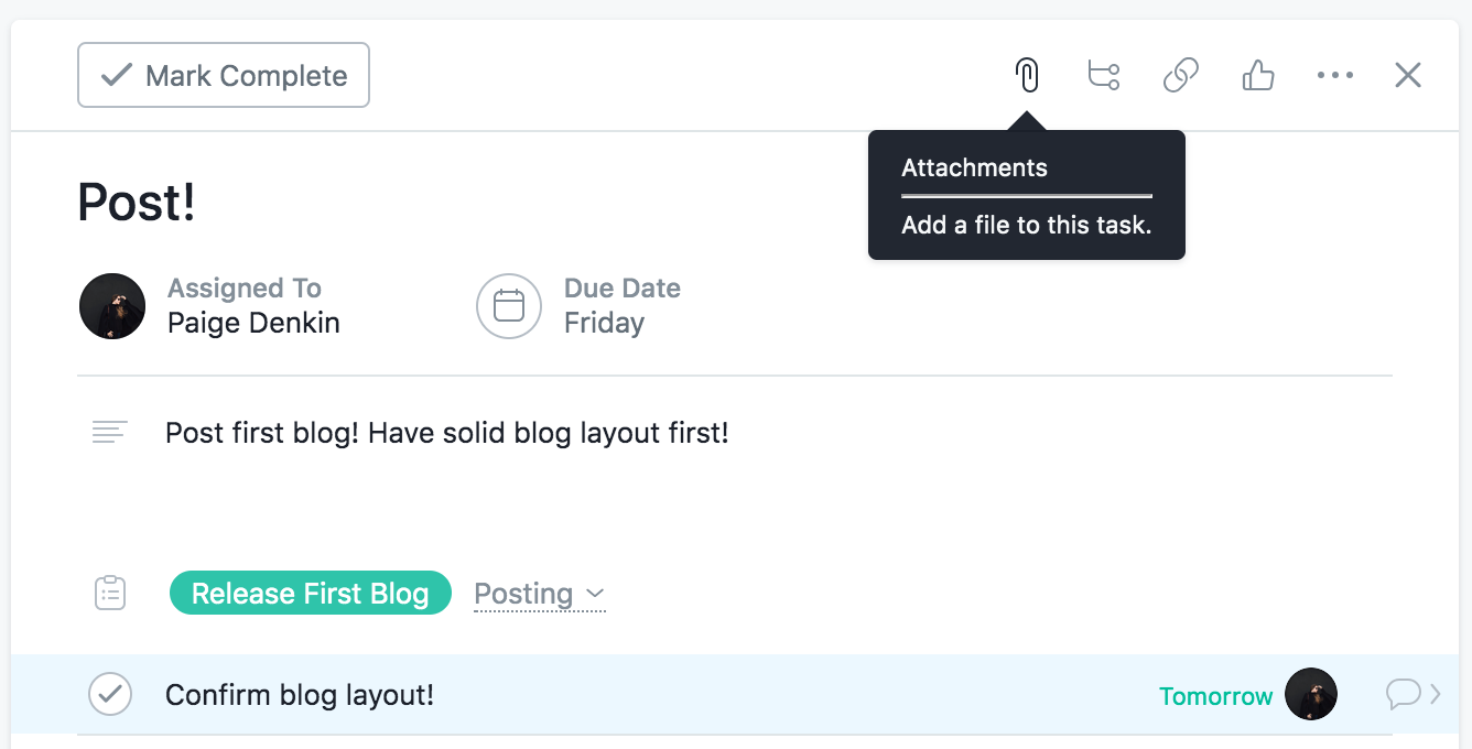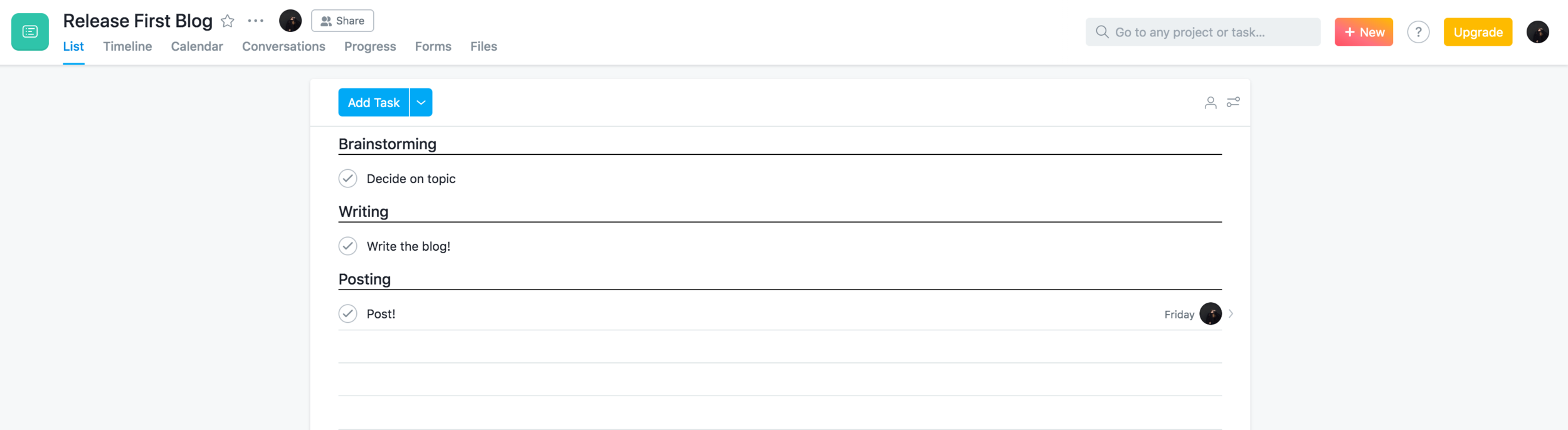 This is what my Asana “Home” looks like! I have one project that I made just for this occasion… can ya tell? The top shows my upcoming tasks, the date’s they’re due and other recent projects currently being managed. In this case, we just have the one… Release First Blog! So let’s open the project up and see what makes Asana tick.