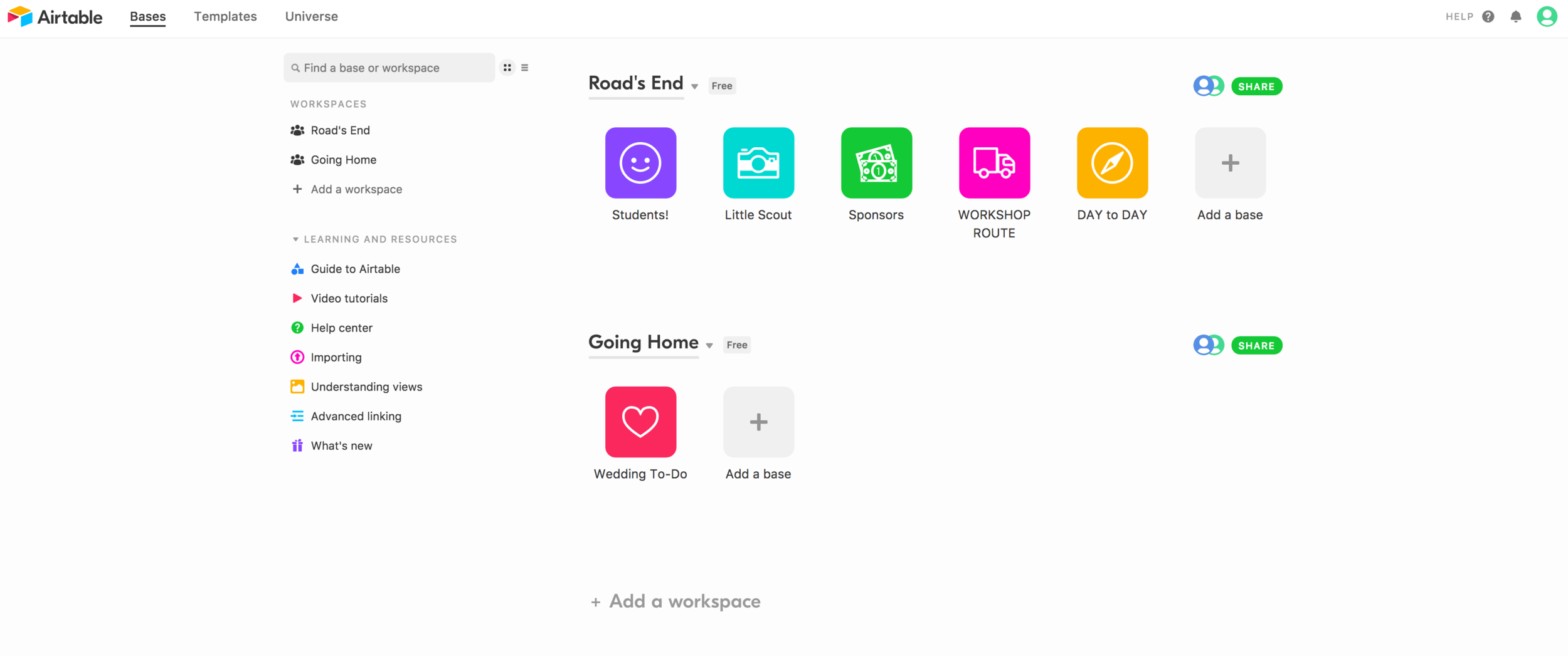 This is my account and my main screen, also referred to as “bases”, as you can see in the top left. The bases are those colorful squares with the icons on them. Those are my tables and they’re being organized in “workspaces”, which I have two of… Going Home (wedding) and Road’s End (workshop + tour). Cool so basically, I have two main sections and documents that directly relate to those main sections. Onwards!