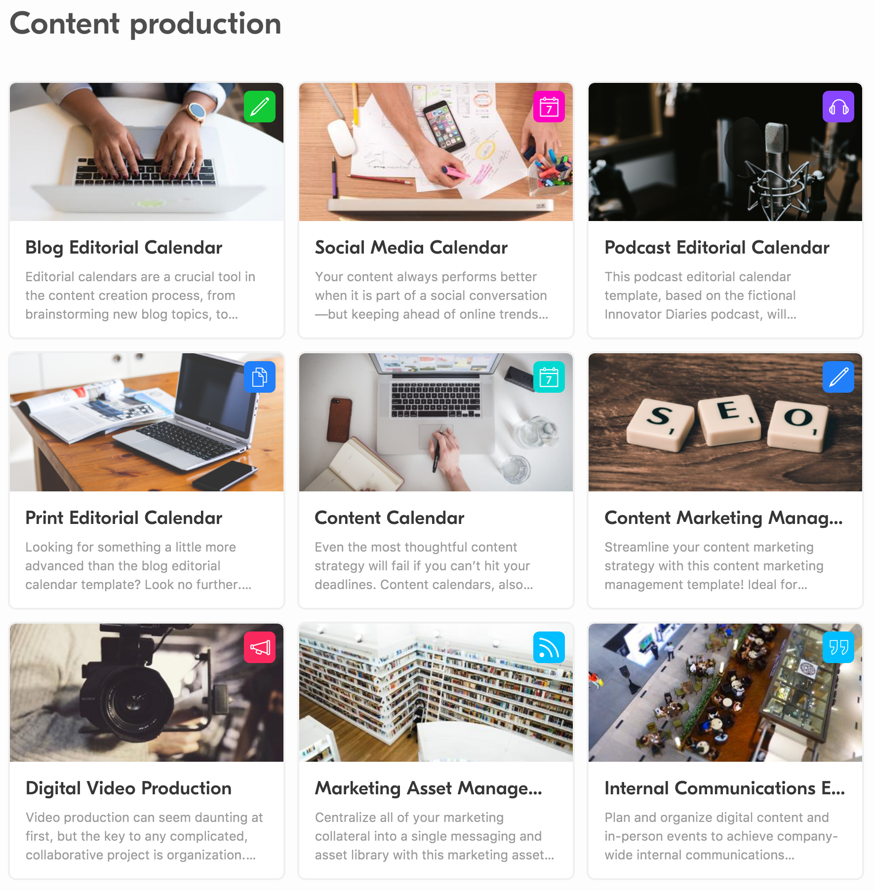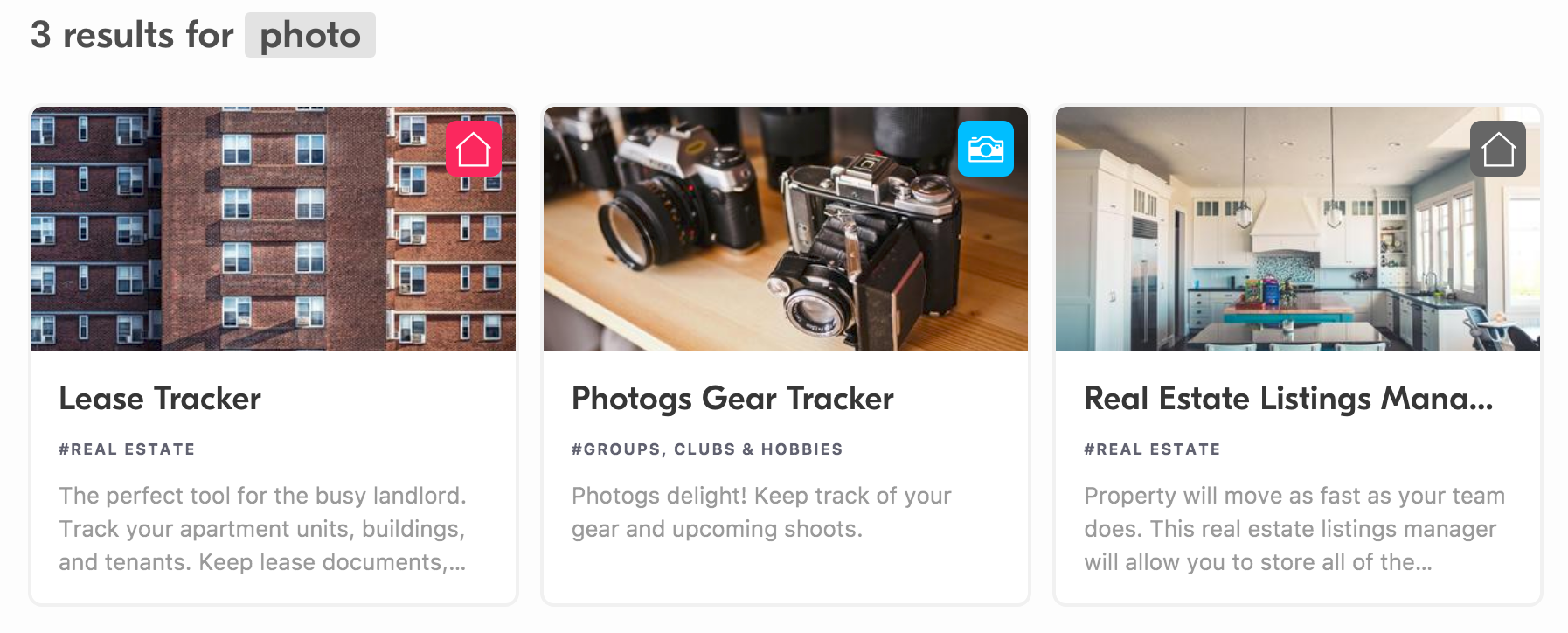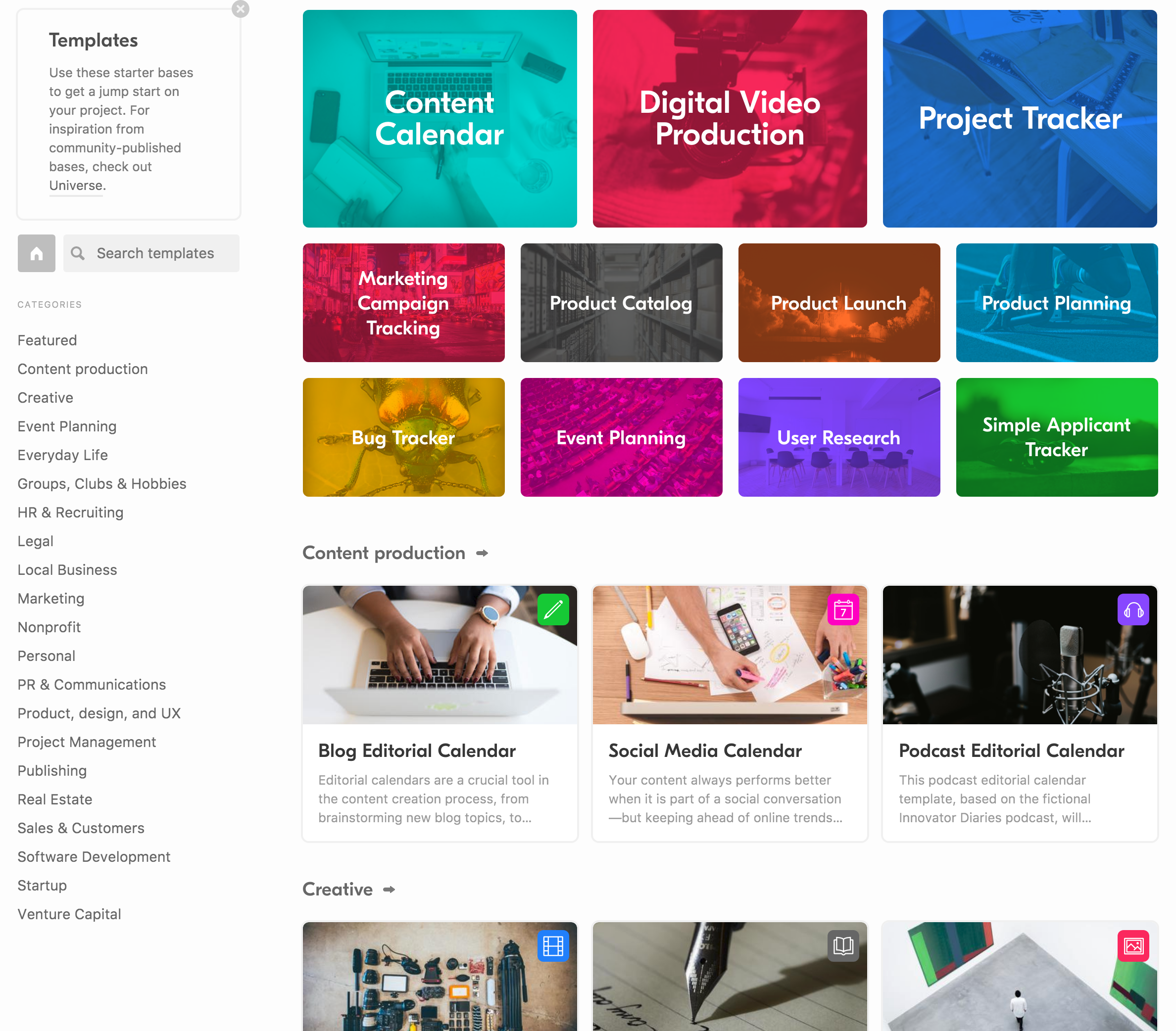A photo gear tracker already exists as an Airtable template! That goes to show how many unique options there are! Here’s one more quick search for something random. I’ll choose one of the pre-made categories they have: content production.