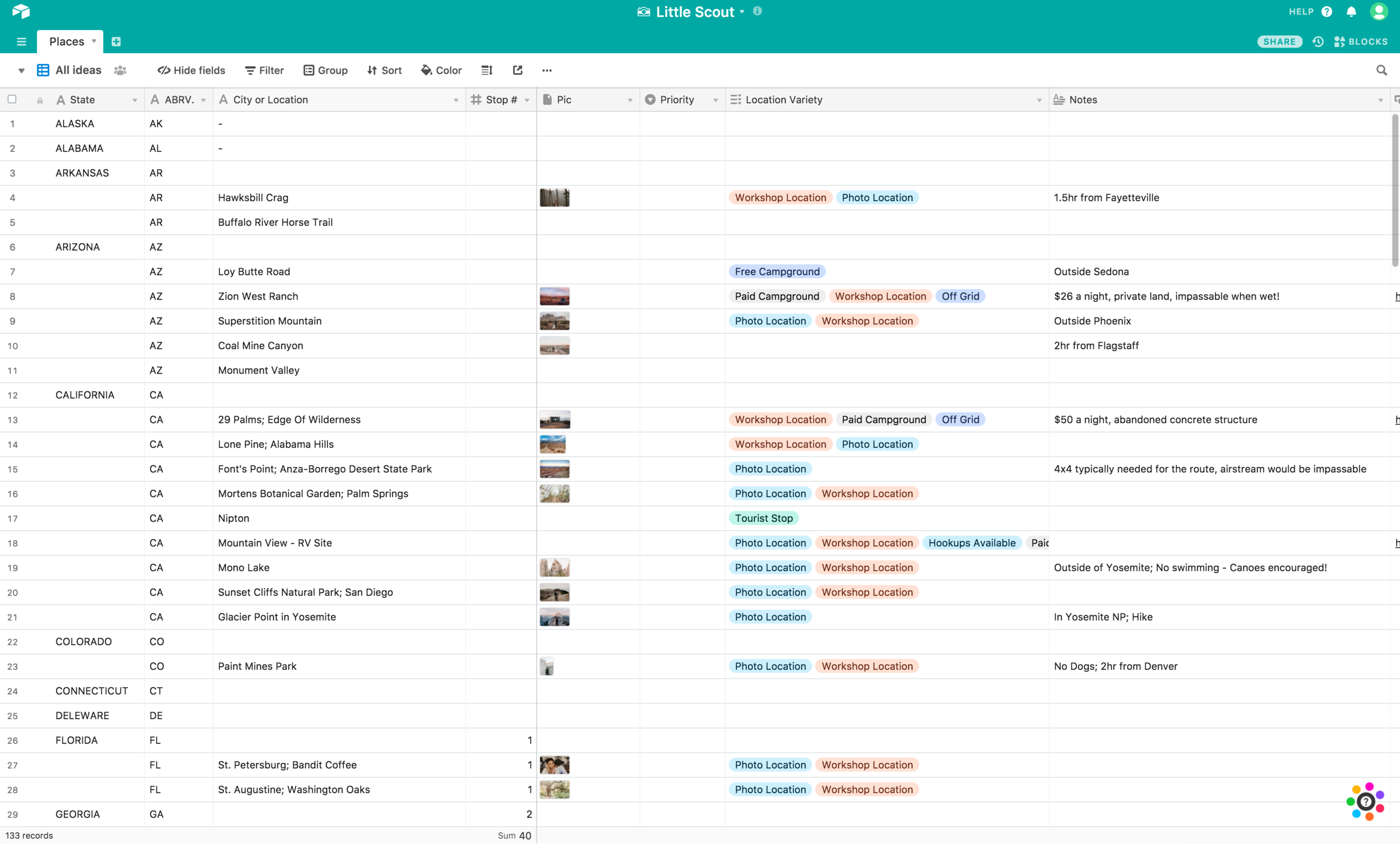 Okay! Let’s stop with the search results and show y’all what we can create on Airtable. I’ll use our Little Scout table as an example. It’s our ongoing list of locations that interest us around the country. The table is searchable and insanely easy to understand and customize to exactly what I need. The way we have it laid out, I can sort the list by numerous filters including state, stop number, campground, workshop location, and any other category I choose to create. Here’s Little Scout!