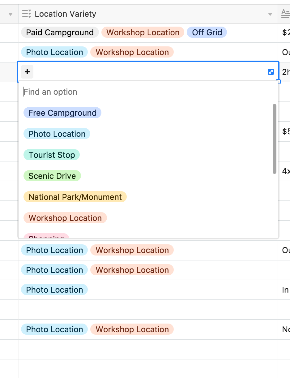 The image on the left shows you most of the options you have when you create a new column in your table. Let me see your other softwares do this! You can choose everything from emails, to images, to dates, checkboxes and multiple selection, which is shown on the right. With the multi select option, you can organize to an even greater extent. The image on the right shows the available multi select options I have for “Location Variety”, so now I can search, filter or sort by any of these options. I can filter it so I only see free campgrounds in Arizona, or scenic drives in Washington. And my favorite part is how each of the rows can be expanded and shown as one entry. Here's Mystic Hot Springs, UT!