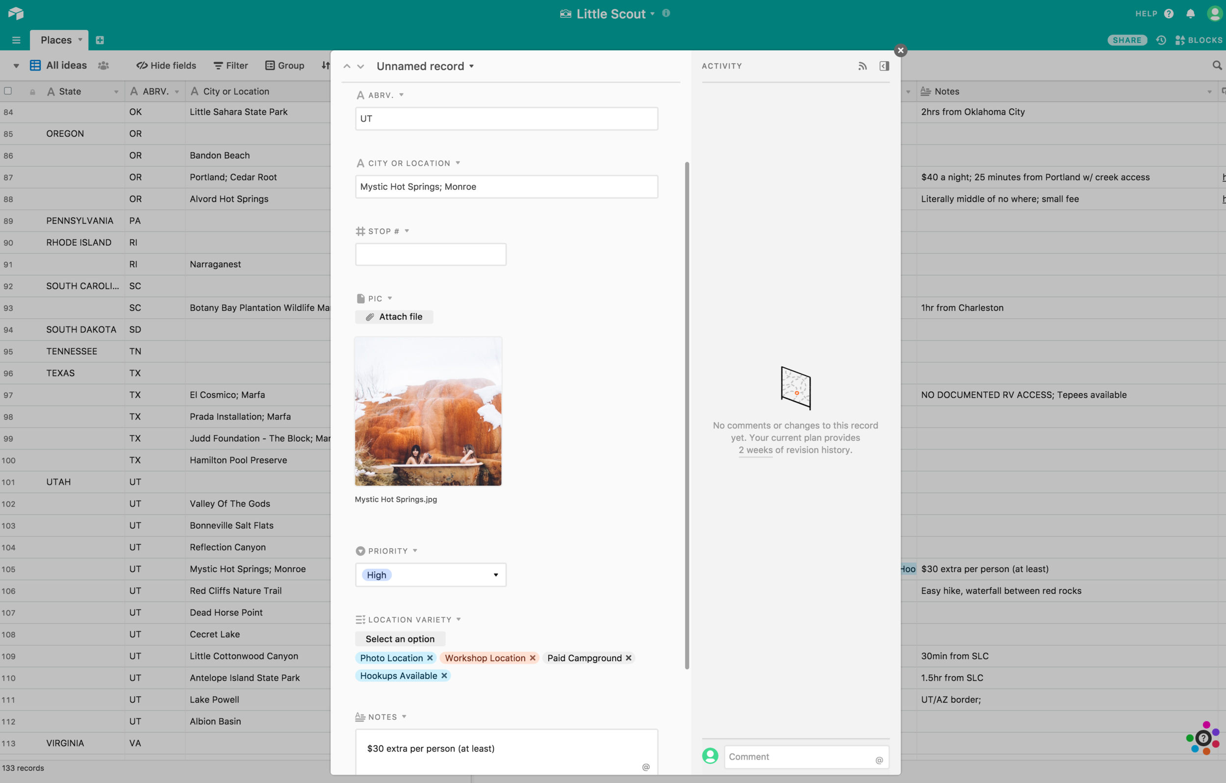 I’m able to see everything I included with this entry in one easy popup. Otherwise it requires quite a bit of scrolling to the side to see and read everything, and all the rows can be tedious sorting through. And this is admittedly a random Pinterest image of Mystic Hot Springs, as I’ve obviously never been there before and it’s listed with “high” priority on our scouting list! An included image helps me recall what the spot looks like and plan accordingly. For instance, this isn’t just a hot spring on our route. Instead, this is that badass location where you can bathe in the spring water in vintage clawfoot bathtubs and if we’re stopping there, you damn well believe I’m finding the steamiest couple I can to work with at this location!